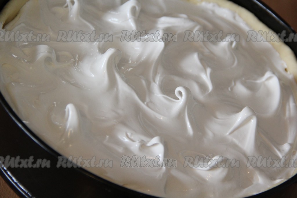 Выложить белковую массу поверх начинки. Сформировать высокие волны. Можно белковую массу поместить в кондитерский мешок и отсадить в виде красивого рисунка. Поставить пирог в разогретую духовку. Выпекать без верхнего нагрева при 180 градусах примерно 45 минут.
