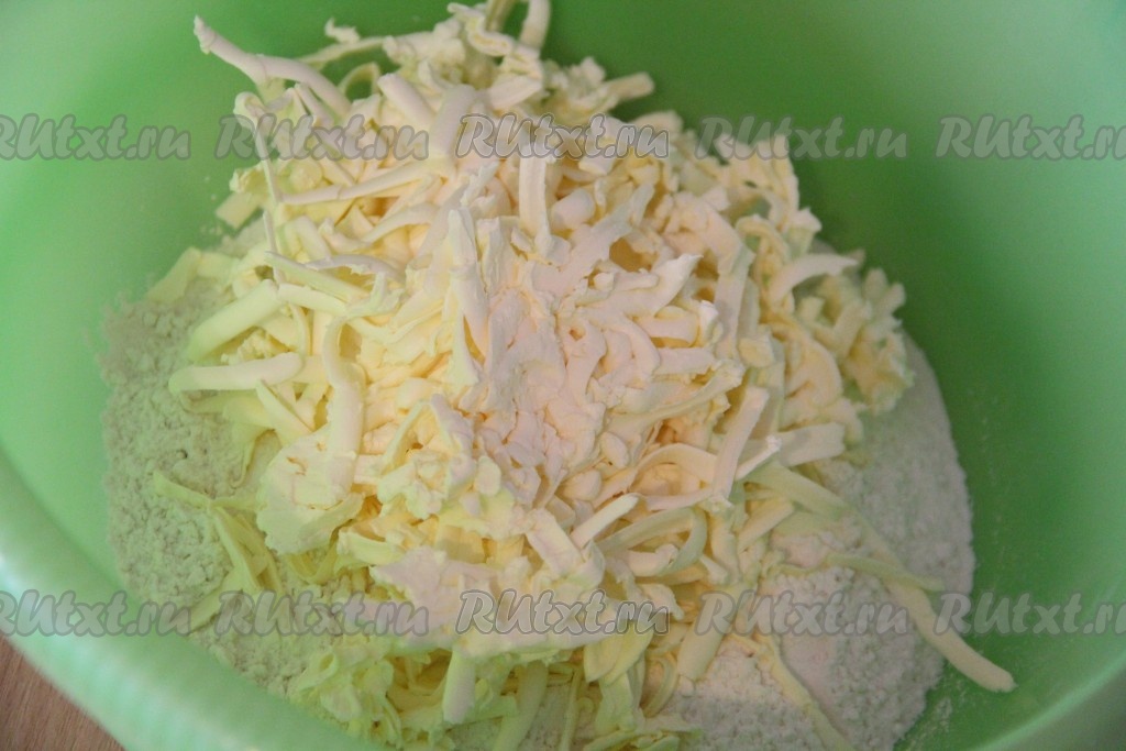 В глубокую миску просеять муку, добавить соль и сахар. Маргарин натереть на крупной тёрке и добавить к муке.