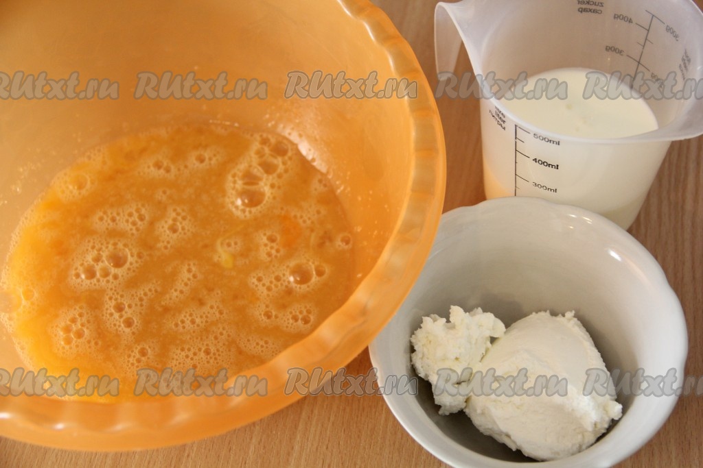 Полученную яичную массу слегка взбить венчиком. Затем добавить кефир, творог и перемешать венчиком до получения однородной массы.