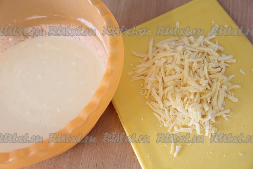 Добавить сыр в основную массу и перемешать, затем всыпать муку и ещё раз перемешать тесто.