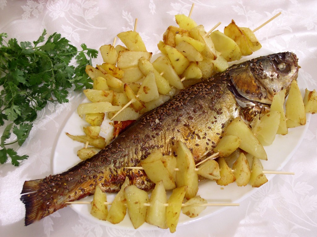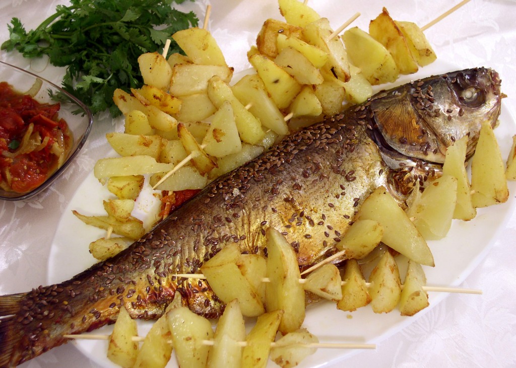 Вот и лето! Сезон шашлыков, рыбалки и пикников! Изумительный вкус рыбы в меду "а-ля шашлык", запеченной в духовке, никого не оставит равнодушным. Рыбу лучше брать не очень крупную, она должна полностью помещаться на противне. Я готовила толстолобика, но для этого блюда прекрасно подойдёт судак, пеленгас, карп. Попробуйте приготовить рыбу по этому рецепту, хлопот минимум, а вкус потрясающий! На гарнир сразу готовим и картофель, потом можно нанизать его на бамбуковые шпажки и застолье будет очень даже ничего и в дождливую погоду, и дома! Правда, разные сорта картофеля попадаются и не каждый нанижется - ломтики могут ломаться. Быстро, празднично, беспроигрышно.