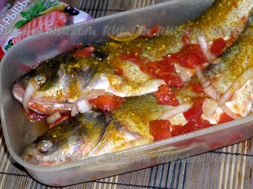 Почистить рыбу, плавники обрезать, жабры удалить, тщательно промыть. Провести внутри рыбки ручкой ножа по хребту, чтобы вышла вся жидкость, ещё раз промыть. Рыбу поместить в ёмкость, посыпать специями, обложить помидорами, нарезанными на кусочки, и кольцами лука, обмазать этой смесью голову и брюшко рыбы. Не забудьте внимательно ознакомиться с составом специй, если соль не входит в их состав, то рыбу нужно посолить (примерно 1 чайная ложка без горки соли). Оставить мариноваться не менее чем на 20 минут. Я оставляла рыбу мариноваться до вечера, так как готовила её на ужин.
