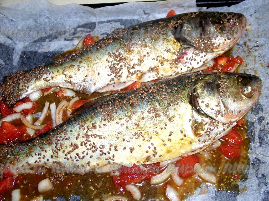 Овощи из маринада можно использовать, как "подушку" под рыбу. Разложить их на застеленный пергаментом противень, сверху выложить рыбу, посыпать кунжутом или семенами льна. Отправить в разогретую духовку и запекать около 30 минут до золотистого цвета. Готовность рыбы можно проверить зубочисткой (проткните спинку, если выделится светлый сок, значит рыба готова). Вкусно, я люблю сочных толстолобиков. Вынимаем рыбу из духовки и оставляем минут на 15 (для равномерного распределения жара внутри рыбы).