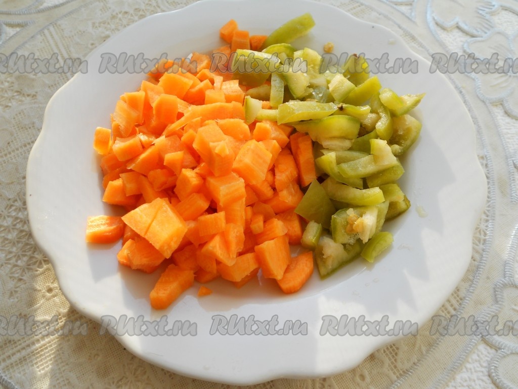 Кабачки и репчатый лук нарезать небольшими кубиками. Также порезать и морковь со сладким болгарским перцем.