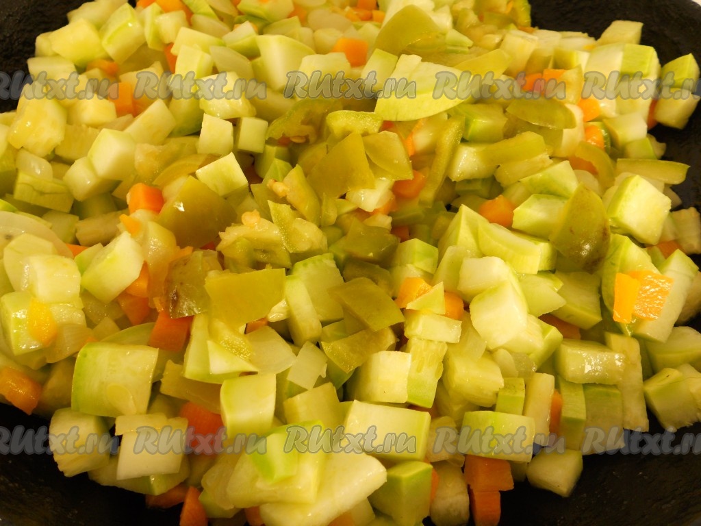 Добавить в сковороду кабачки и сладкий болгарский перец, немного посолить. Обжаривать овощи вместе при помешивании 5-7 минут.