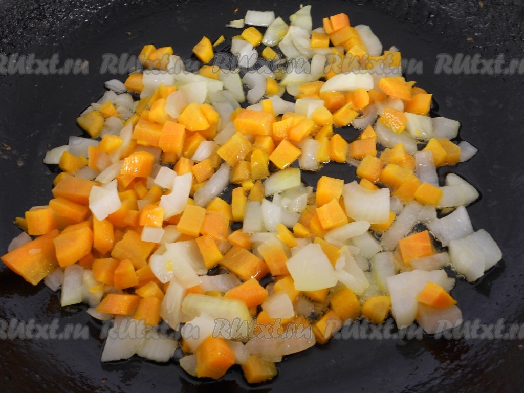 Сковороду разогреть с растительным маслом, выложить на нее лук и морковь. Обжаривать на среднем огне минут 5.