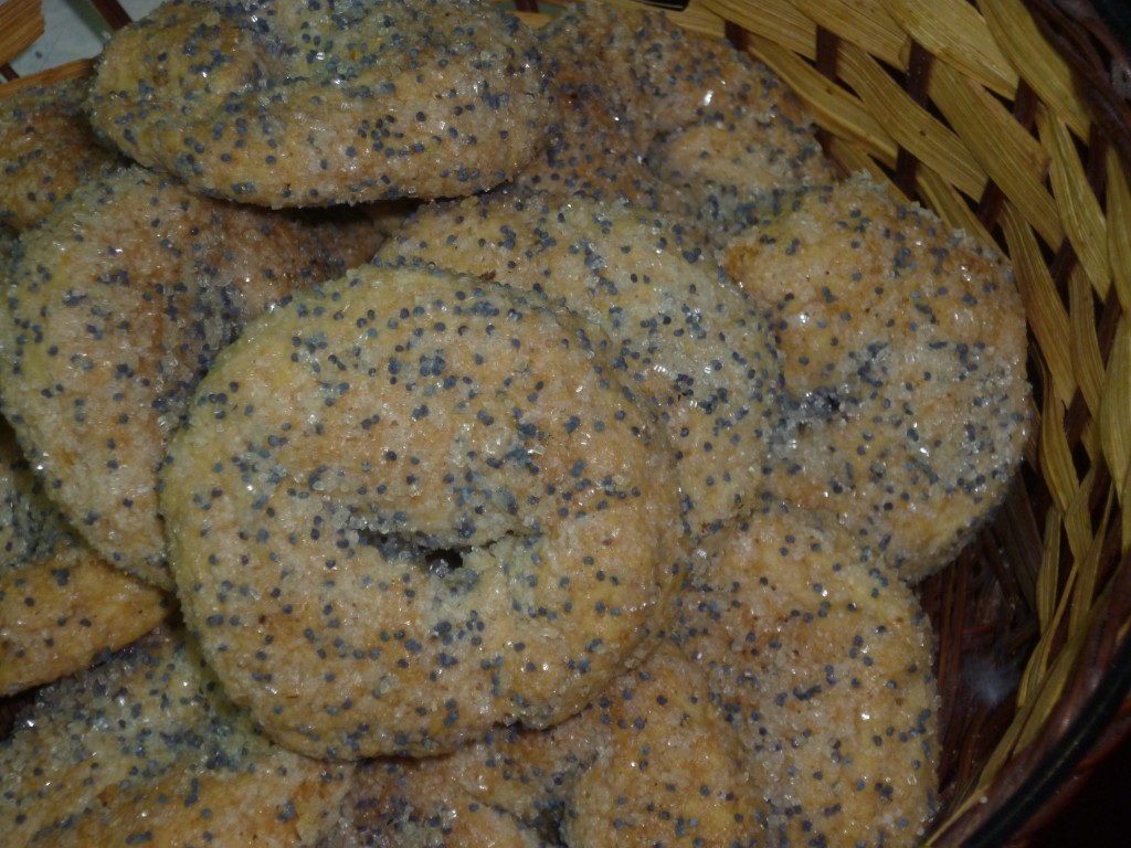 Концы каждой палочки скрепить, чтобы получились бублики. Выложить на противень, застеленный бумагой для выпечки (либо без нее), посыпать 1 столовой ложкой сахара и отправить в духовку, разогретую до 180 градусов, минут на 20.