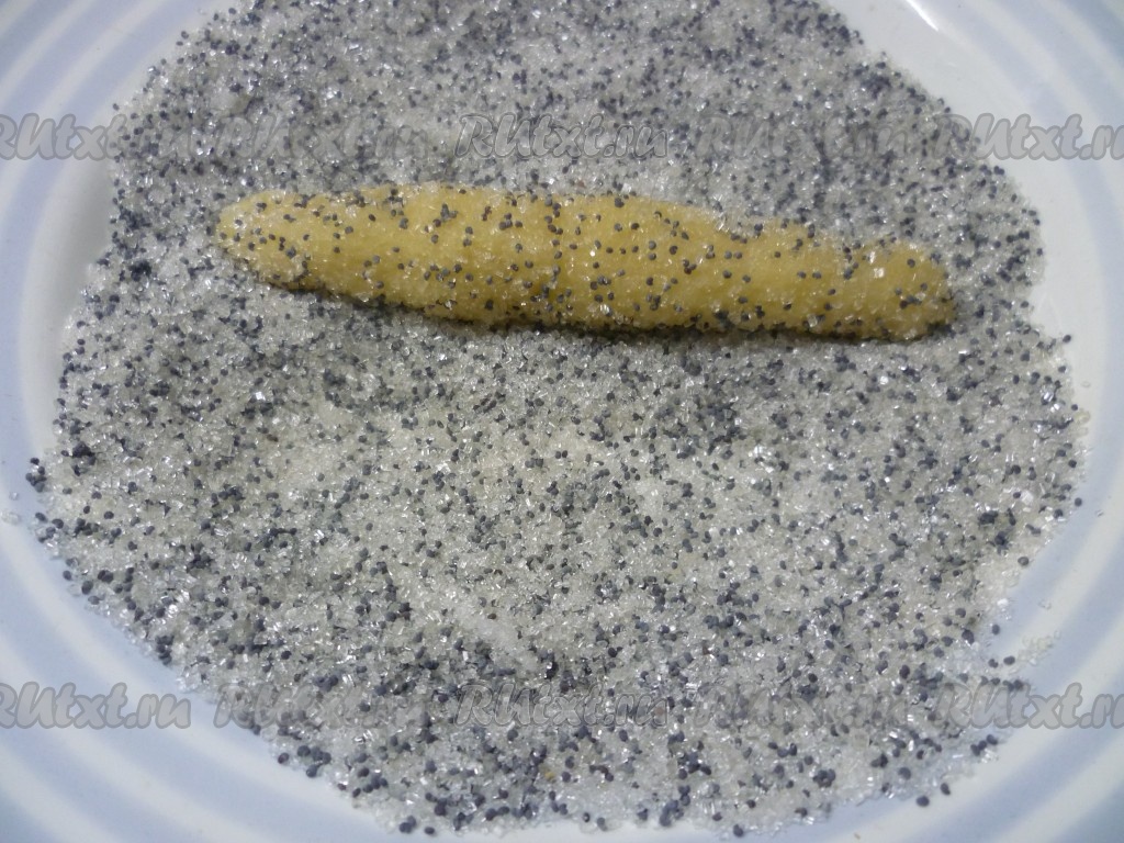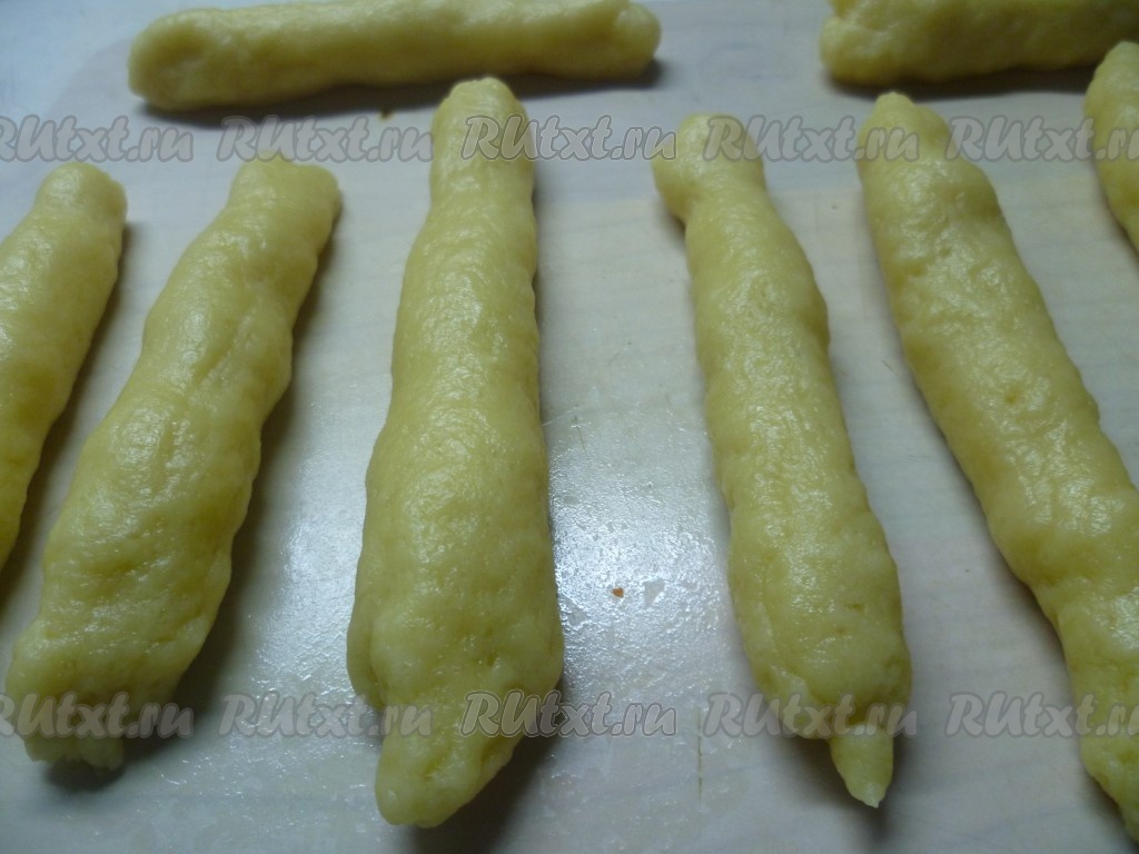 Сформировать из теста палочки, зауженные по краям, длиной примерно 10 см и толщиной - 1 см.
