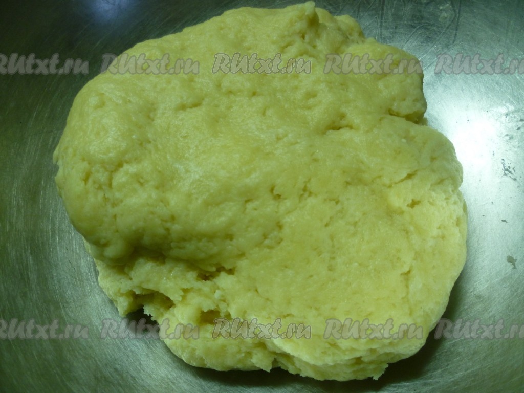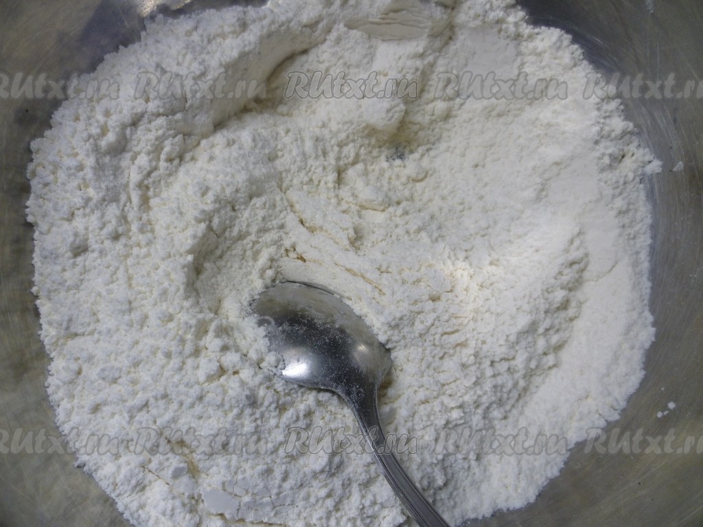 Просеять муку с разрыхлителем. В полученную смесь добавить размягченное сливочное масло, соль, 2 столовые ложки сахара и ванилин.