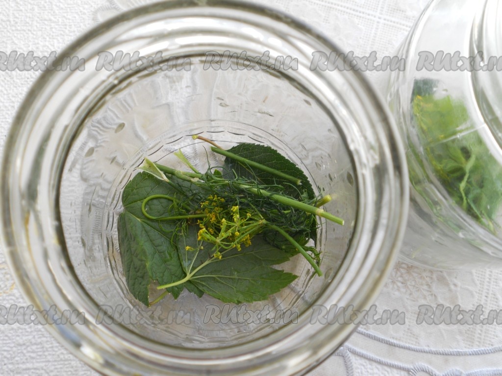 На дно чистых баночек поместить укроп, листья вишни и смородины.