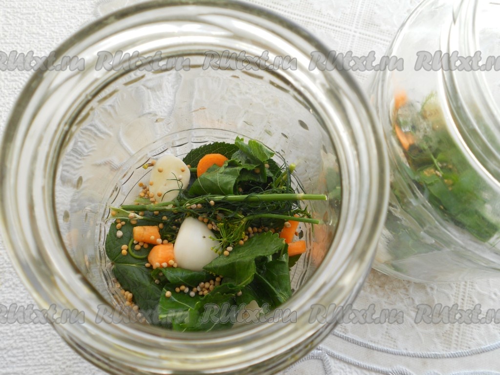Сюда же добавить листья хрена, морковь, порезанную кружочками, чеснок, всыпать зернистую горчицу.