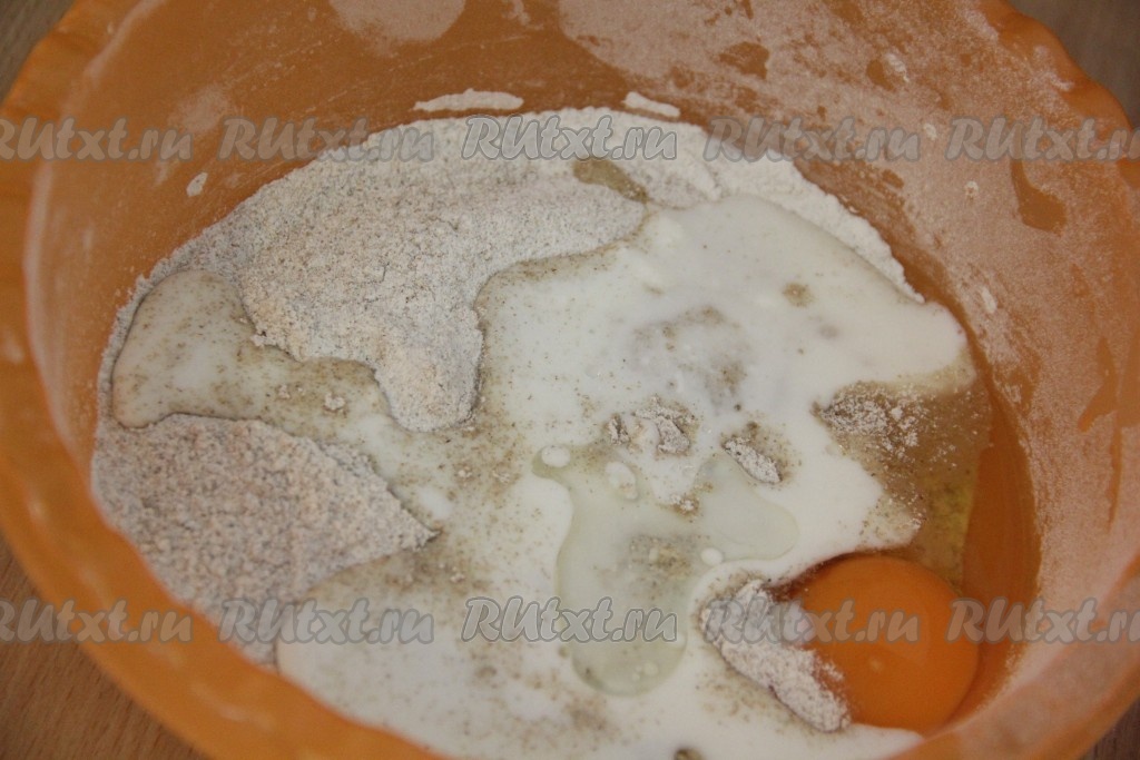 В кефир добавить соду и хорошо перемешать. Добавить в мучную смесь кефир, яйцо и растительное масло.