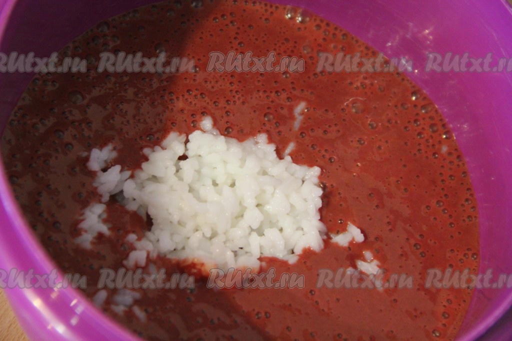 Перелить получившуюся массу в глубокую миску, добавить рис и хорошо перемешать ложкой.