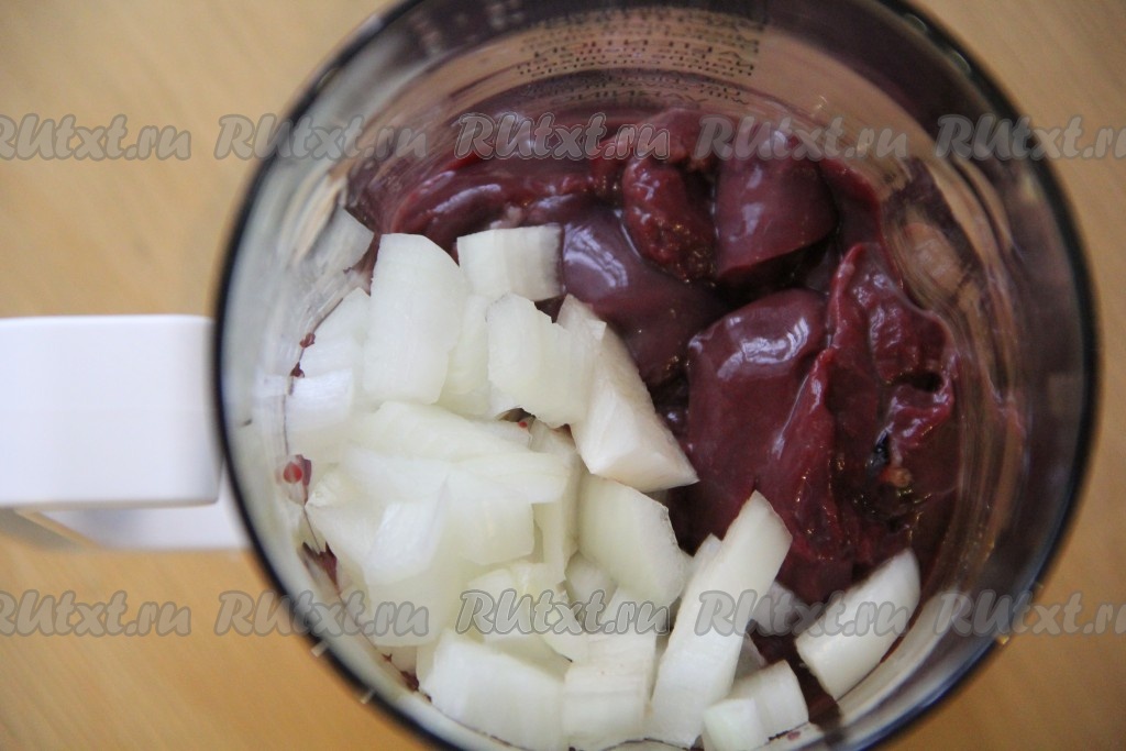 Лук почистить и мелко нарезать. В чашу блендера поместить печень и лук. Всё хорошо измельчить до однородного состояния.