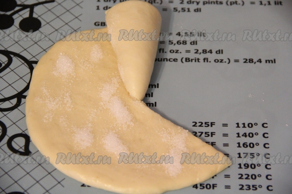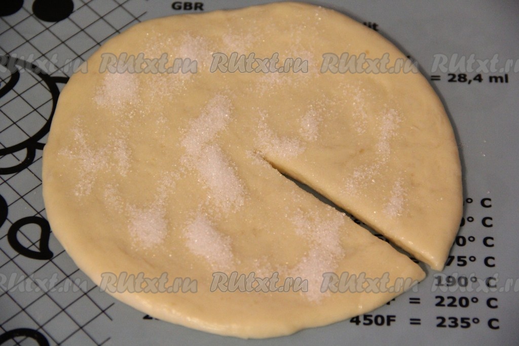 Каждую часть теста раскатать в круглую не тонкую лепёшку, присыпать её сахаром и сделать один разрез от центра до края.