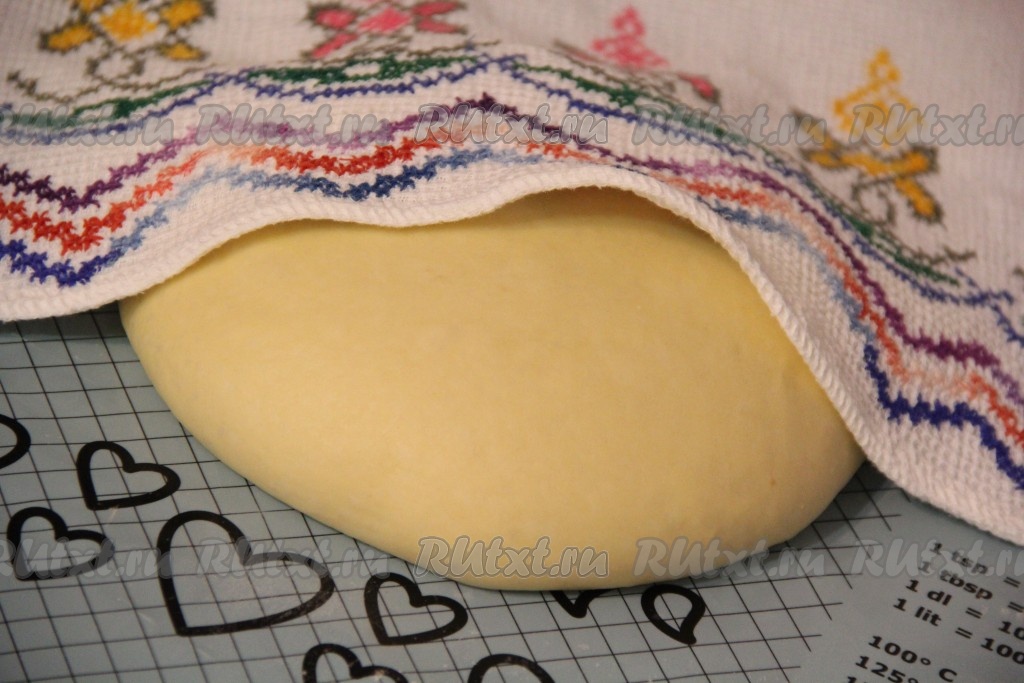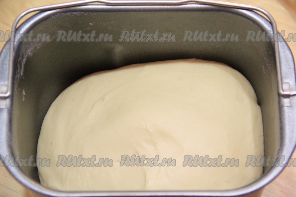 Поднявшееся сдобное творожное тесто для булочек достать из хлебопечки, хорошо обмять и оставить на столе под полотенцем на 30-40 минут.