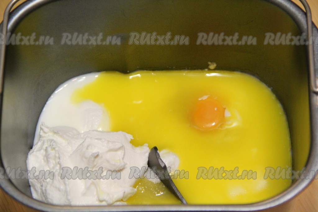 Сливочное масло предварительно растопить до жидкого состояния. Масло должно быть жидким и тёплым, но ни в коем случае не горячим. Это важно! В ведёрко хлебопечки влить кефир комнатной температуры, добавить сырое яйцо и растопленное масло. Затем всыпать сахар и добавить творог.