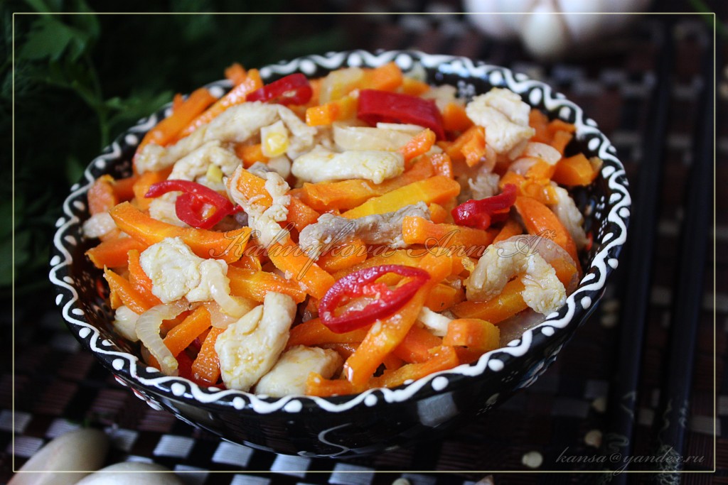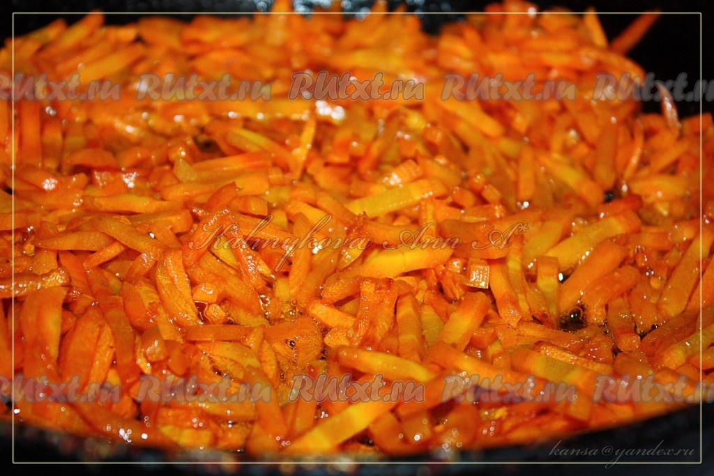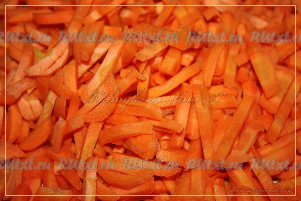 Приступим к приготовлению заправки: очищенную морковь нашинковать брусочками.