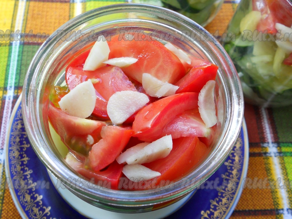 Крайний слой - помидоры, нарезанные средними дольками. На помидоры - чеснок (тонкими пластинками).