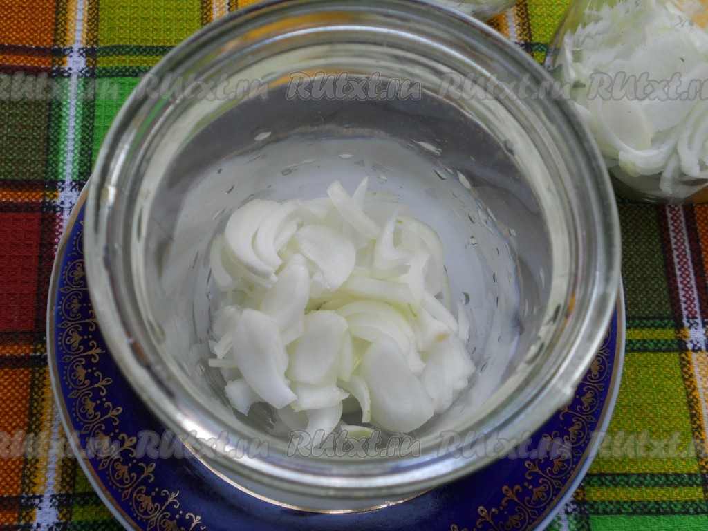 На дно чистой баночки (стерилизовать не стоит) влить растительное масло, поместить нарезанный перьями репчатый лук.