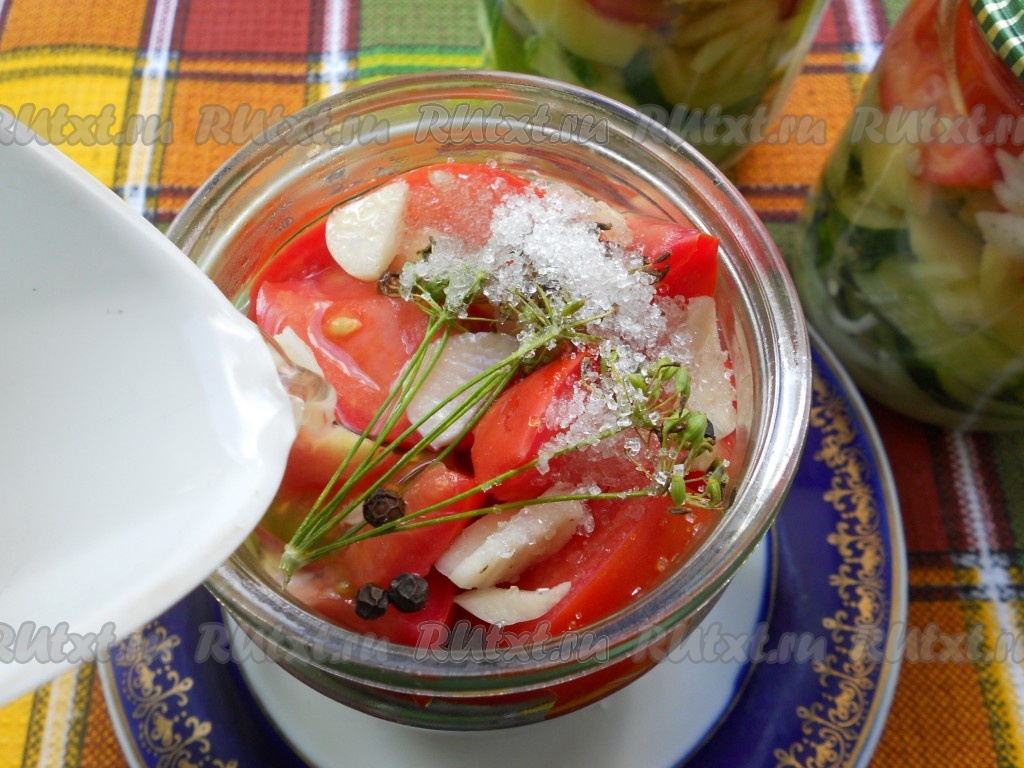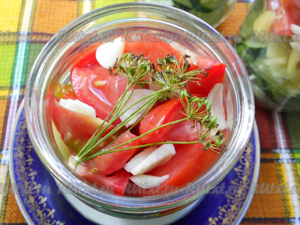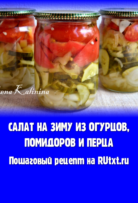 Хочу предложить вам заготовить замечательный салат на зиму из огурцов, помидоров и перца. Салатик получается очень вкусным. Зимой открыть баночку такого салата, да предложить своим родным к отварной или жареной картошечке - одно удовольствие! Попробуйте обязательно! Расчет продуктов дан на 1 пол-литровую баночку салата.