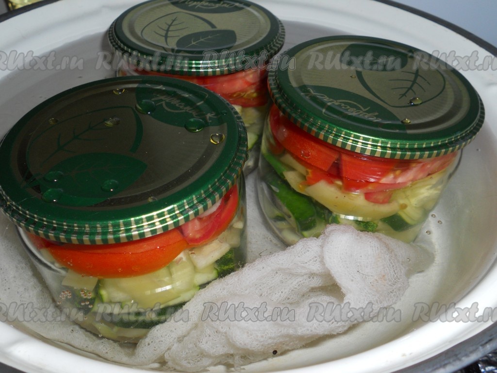В большую кастрюлю влить горячую воду, на дно поместить чистую тряпочку или полотенце. Поместить баночки с салатом, накрытые крышкой, в кастрюлю так, чтобы они не касались друг друга. Поставить кастрюлю на огонь, стерилизовать салат 10 минут с момента закипания воды.