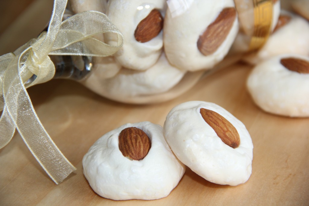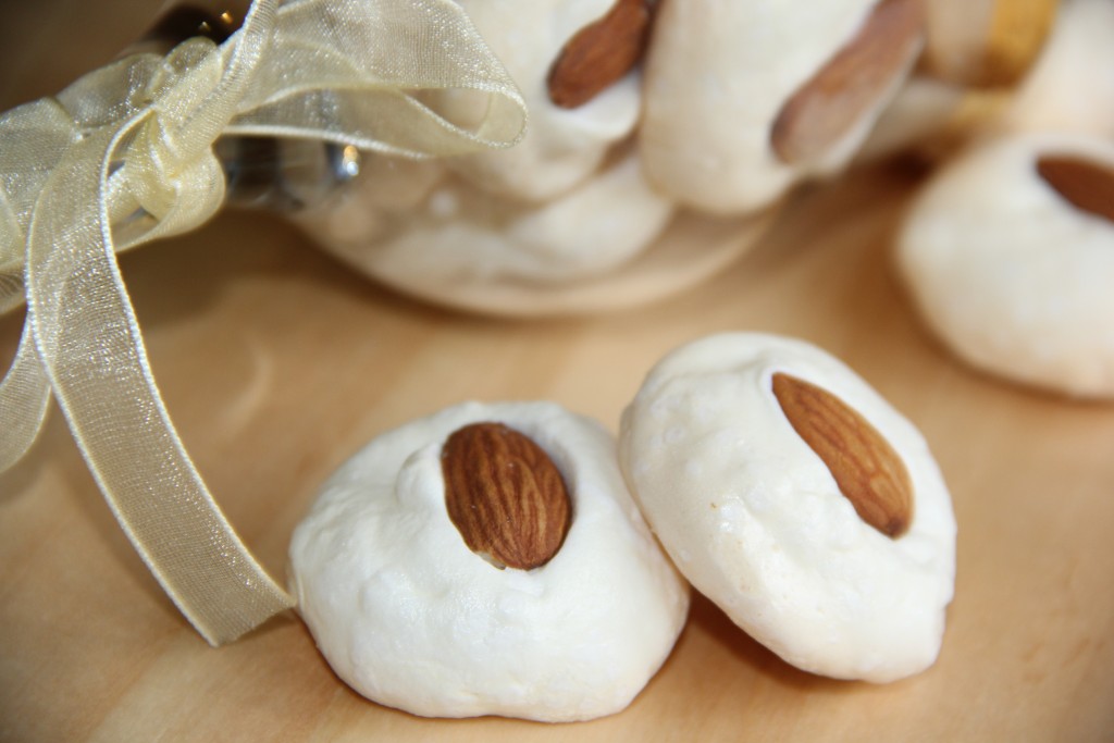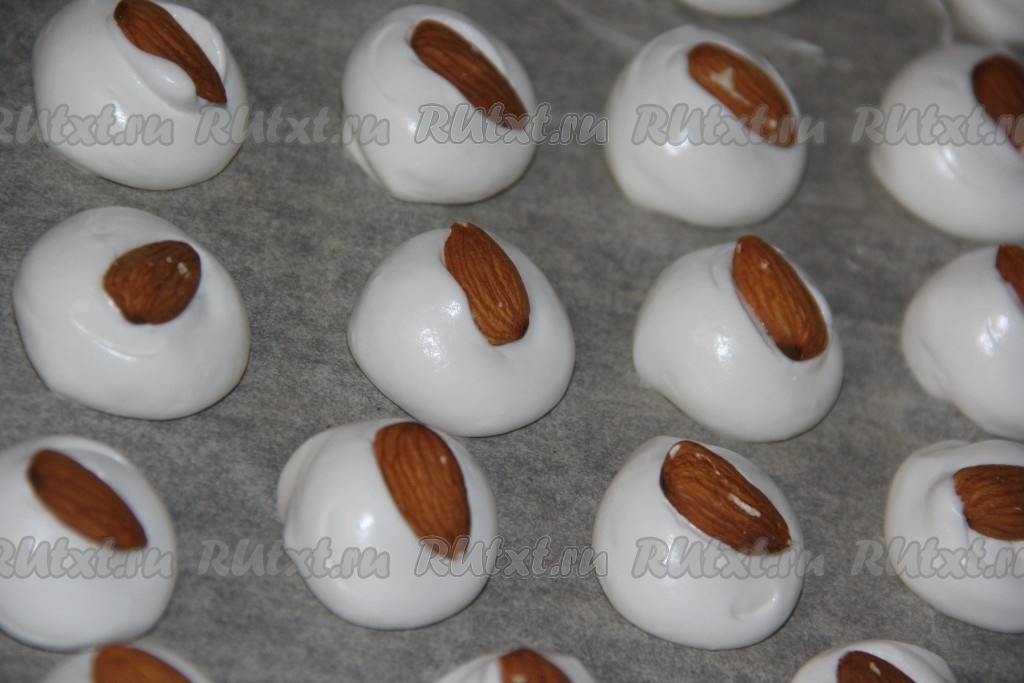 Переложить белковую массу в кондитерский мешок с круглой насадкой. Если у вас нет кондитерского мешка, то можно сформировать безе с помощью ложки. Противень для выпекания застелить пергаментной бумагой. Отсадить белковую массу на противень на расстоянии друг от друга. Безе можно отправлять в духовку и в таком виде, но чтобы сделать вкус более интересным, можно украсить каждую безешку миндалем.