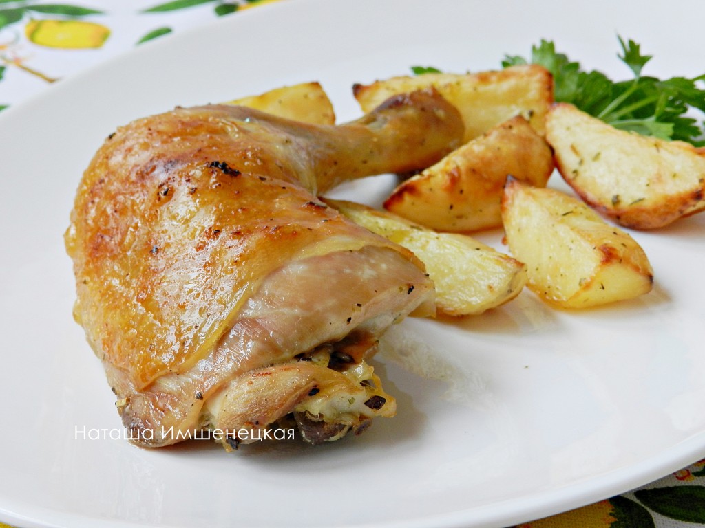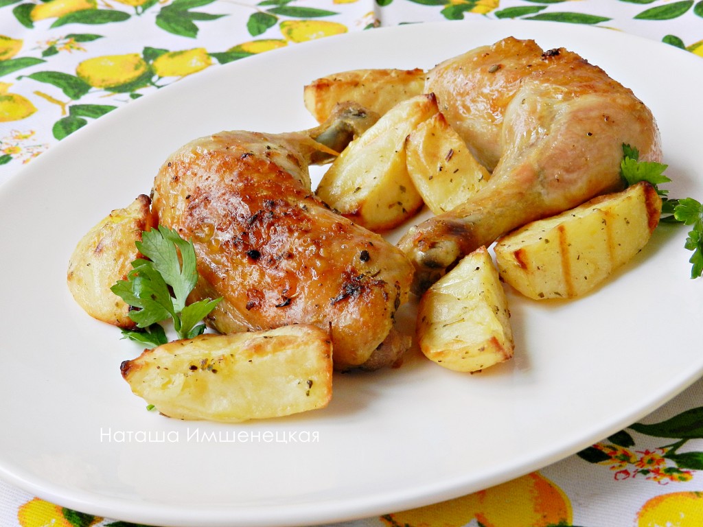 Вкусные и ароматные куриные ножки, запеченные с картошкой в духовке, готовы.
