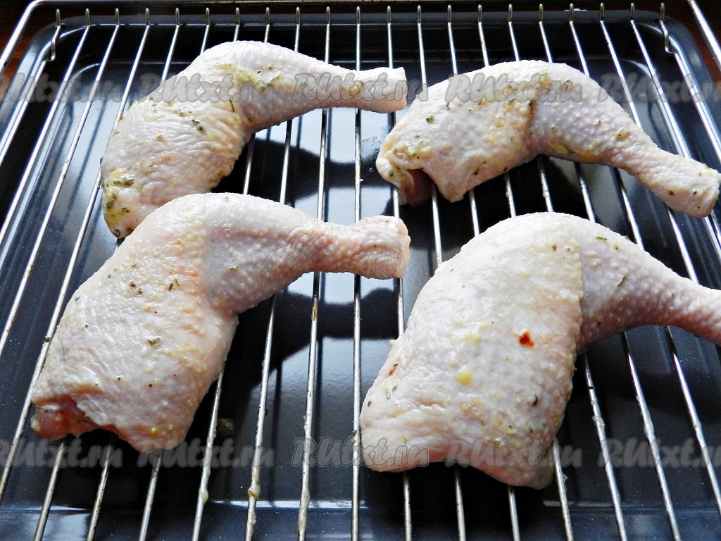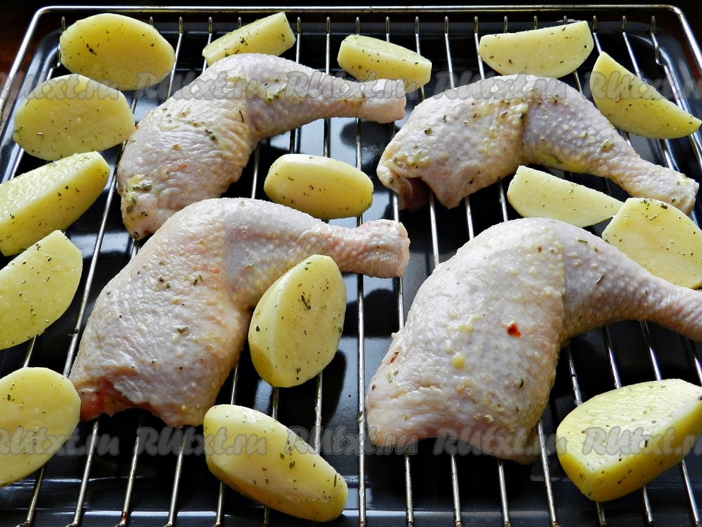 Натереть куриные ножки приготовленной масляной смесью (1 столовую ложку смеси оставить для картофеля), оставить на полчаса.
