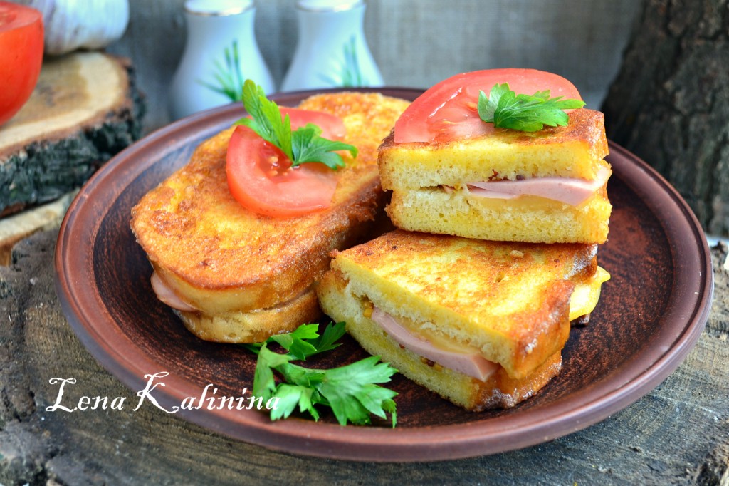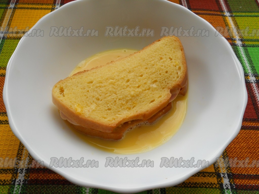 Хорошенько взбить вилкой. Полностью обмакнуть бутерброд в яичную смесь.