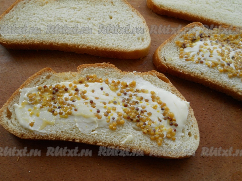 Размягченным сливочным маслом и французской горчицей смазать два ломтика батона.