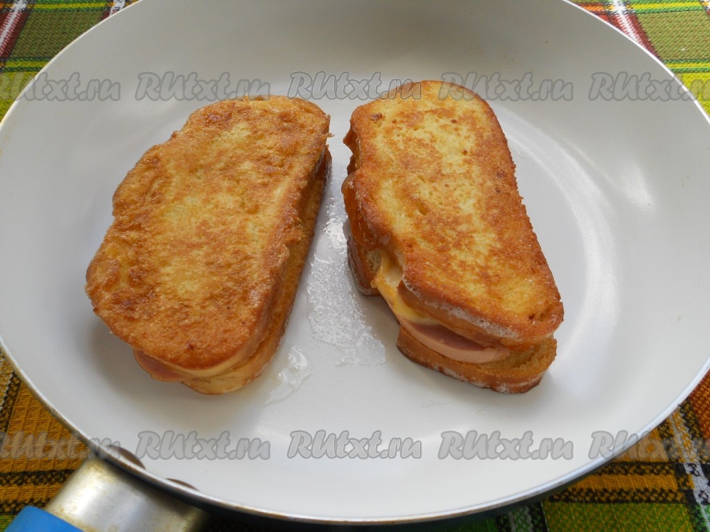 Разогреть сковороду с растительным маслом. Выложить бутерброды и обжарить на небольшом огне с двух сторон до появления румяной корочки.