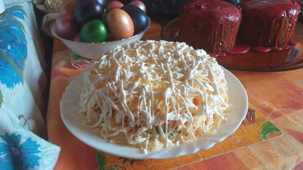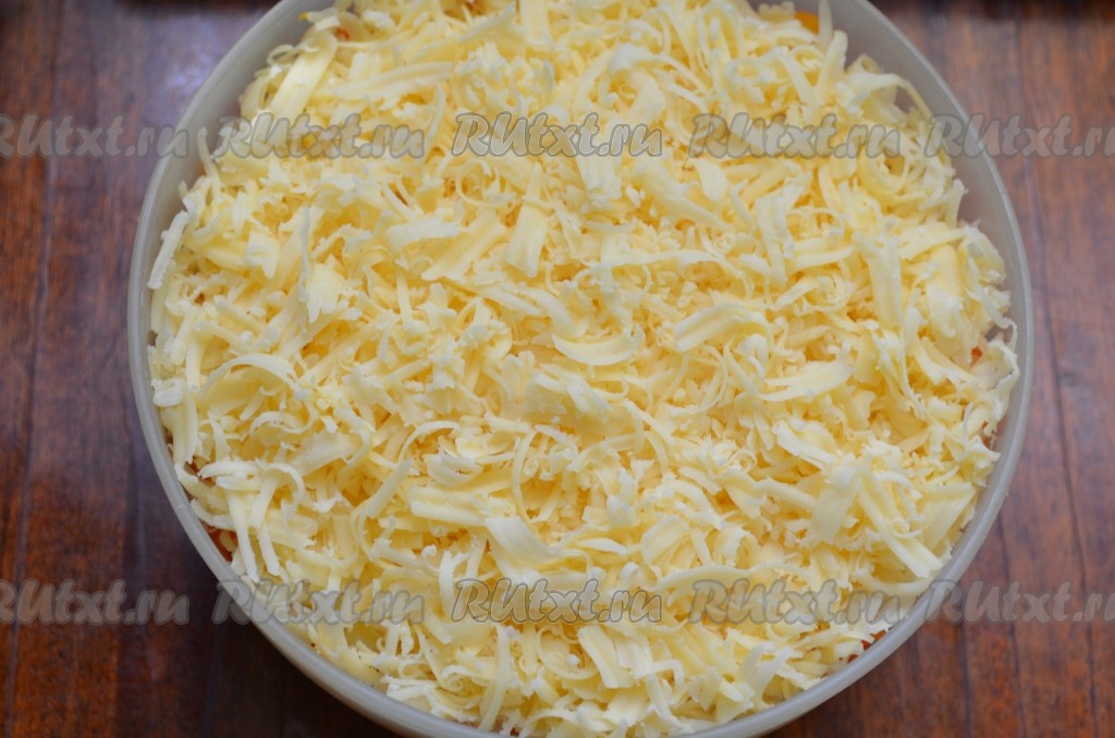 Завершающим слоем будет сыр, натёртый на средней тёрке.