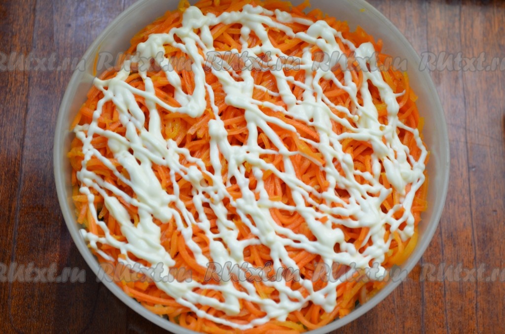 Полоски моркови по-корейски разрезать на 3-4 части. Поверх слоя огурцов разложить корейскую морковку, смазать майонезом.
