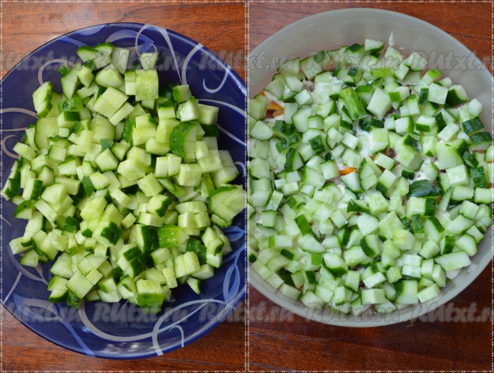 На курицу выложить слой огурцов, нарезанных на мелкие кубики. Майонезом можно не смазывать.