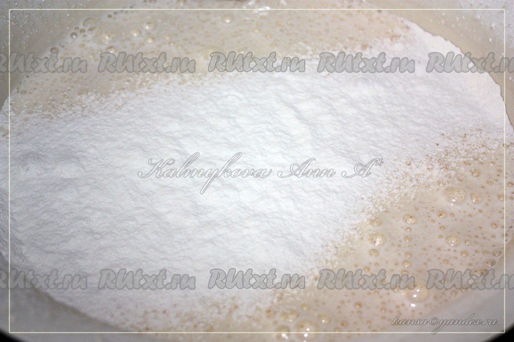 Разрыхлитель смешать с мукой и добавить к яично-сахарной массе, перемешать.
