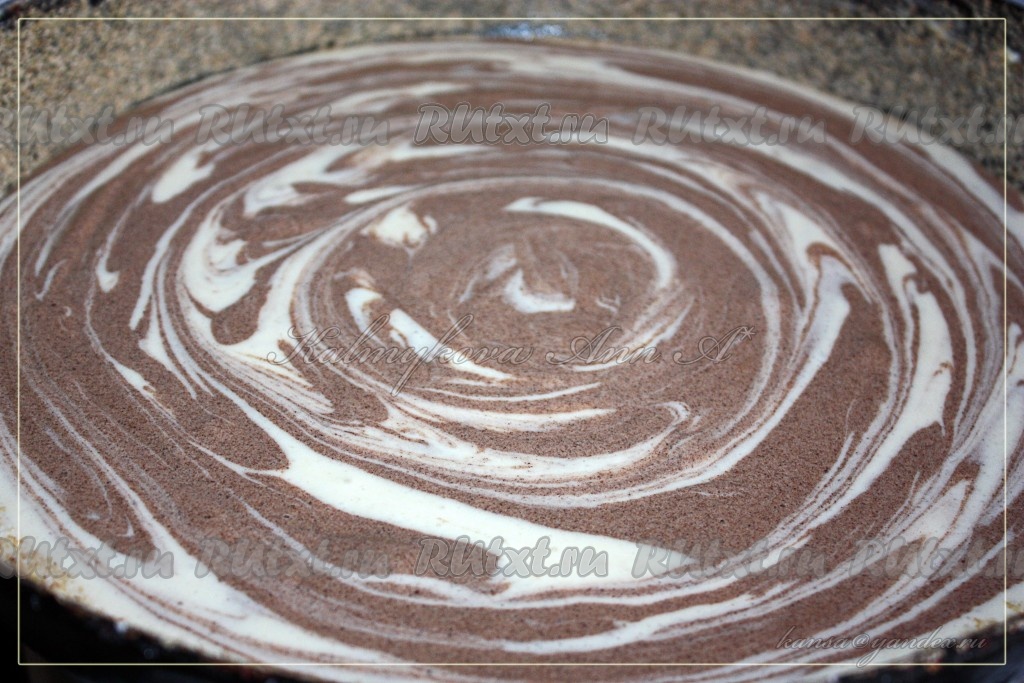 Из обеих мисок вылить тесто в форму. Выпекать в разогретой духовке при 180 градусах около 30-45 минут (готовность проверить шпажкой).