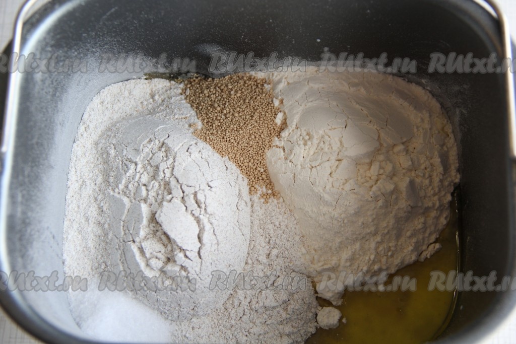 Затем всыпать пшеничную и ржаную муку, соль и сухие дрожжи. Соль и дрожжи старайтесь всыпать по разным углам ведёрка хлебопечки. Выставить режим выпечки "Основной", у меня этот режим занимает 3 часа 20 минут, вес буханки - 750 грамм, цвет корочки - средний.