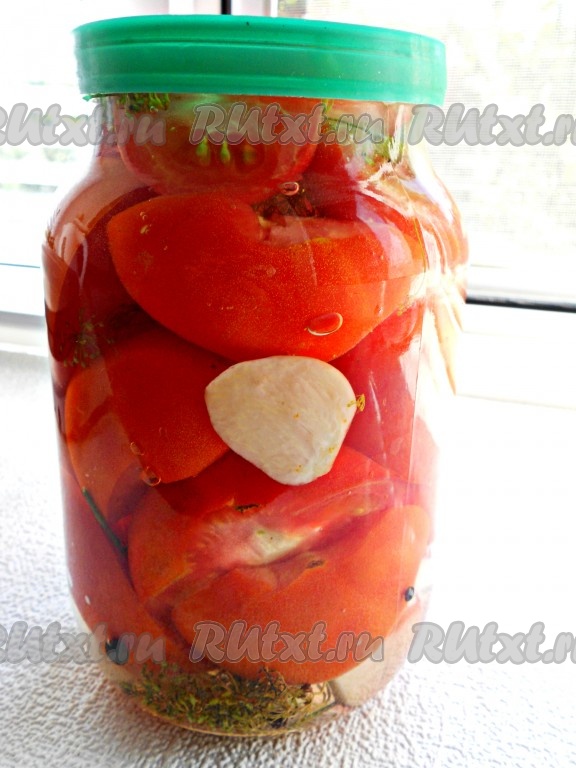 Сверху также - оставшийся укроп, перец и чеснок. Залить помидоры подготовленным рассолом.