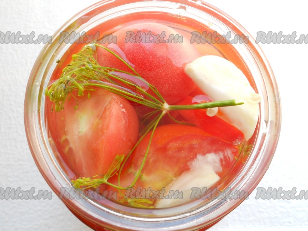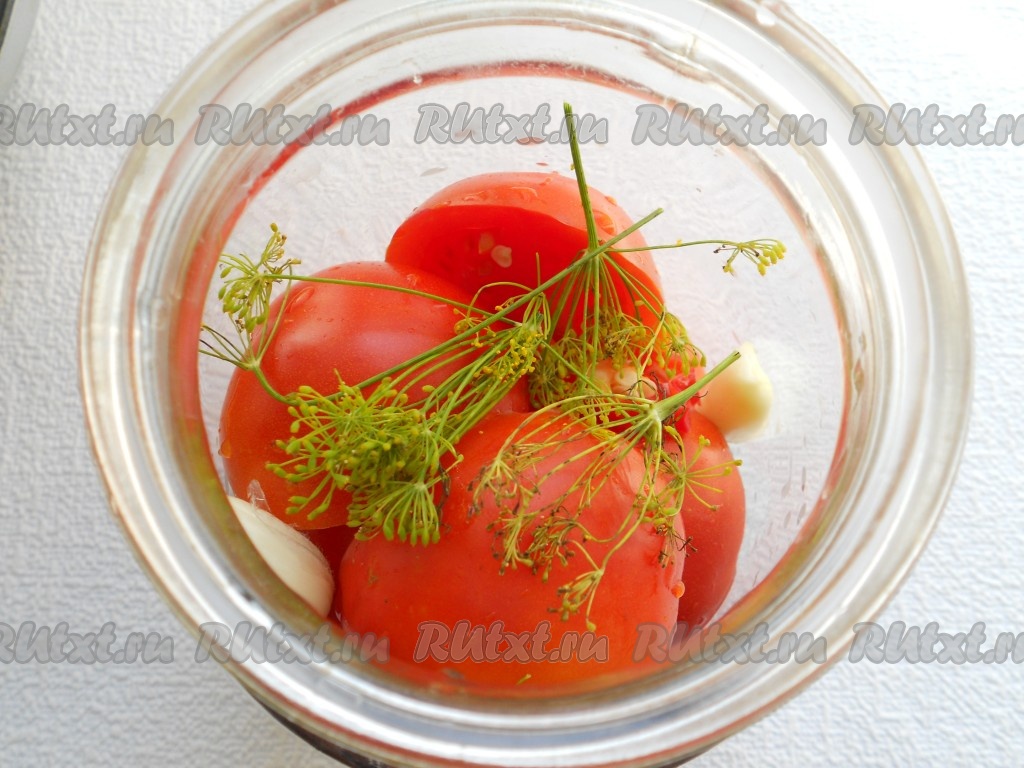 Помидоры вымыть, разрезать пополам, удаляя место крепления плодоножки. Наполнить банку половинками помидоров, выкладывая их срезом вниз. Между помидорами поместить по зубчику чеснока, кружочку горького перца и зонтику укропа.