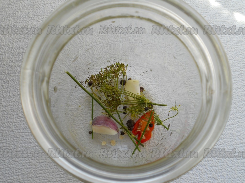 На дно простерилизованной 1-литровой банки выложить зонтик укропа, несколько очищенных зубчиков чеснока, колечко горького перца, горошины чёрного и душистого перцев.