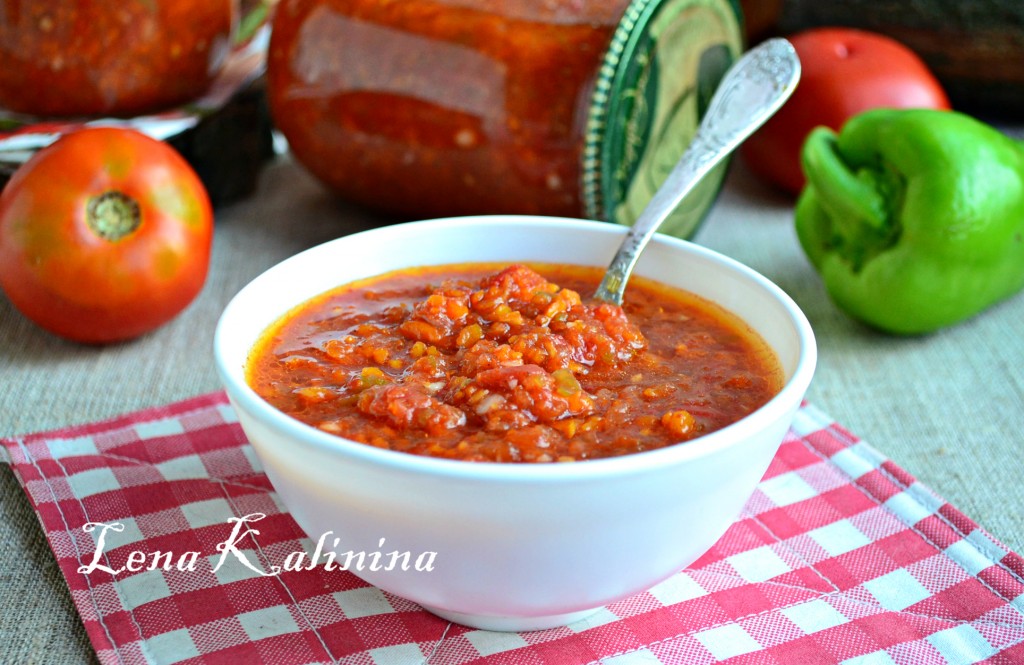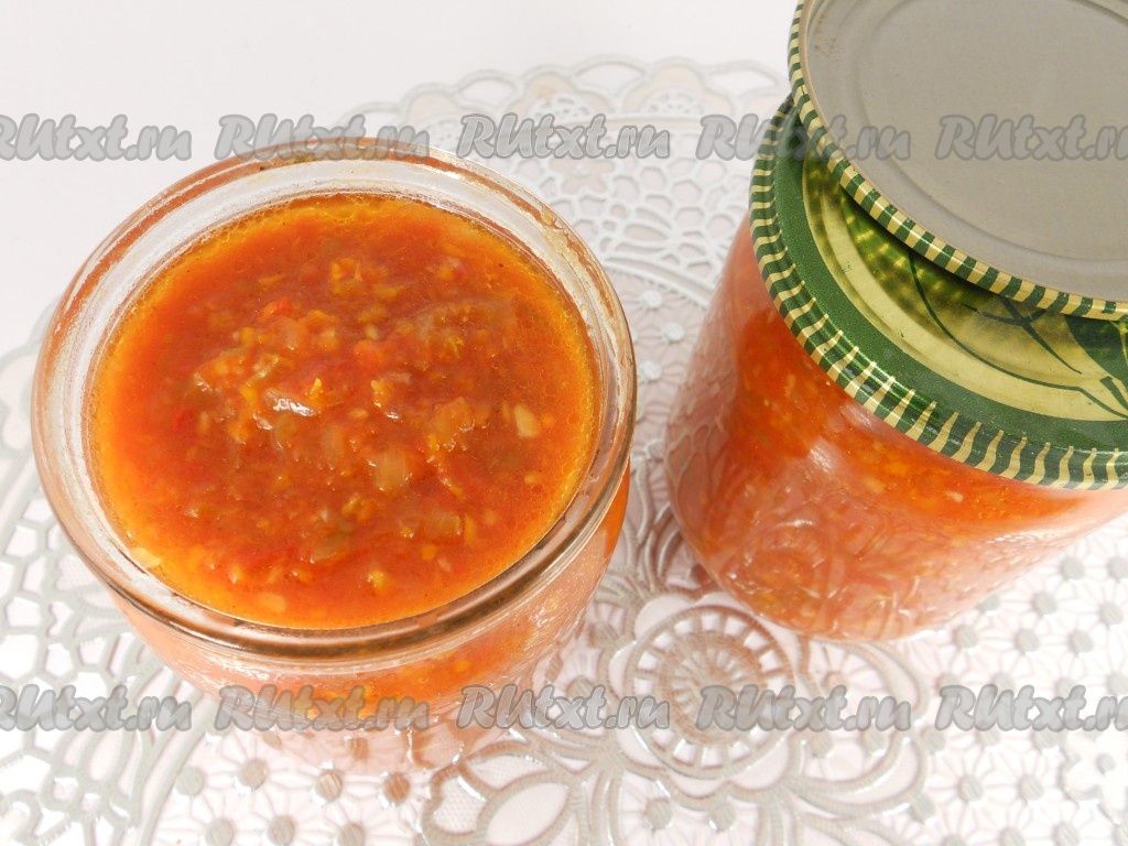 Остывшие банки с вкуснейшей аджикой из помидоров и перца поставить на хранение до зимы. Хранится в кладовке, при комнатной температуре.