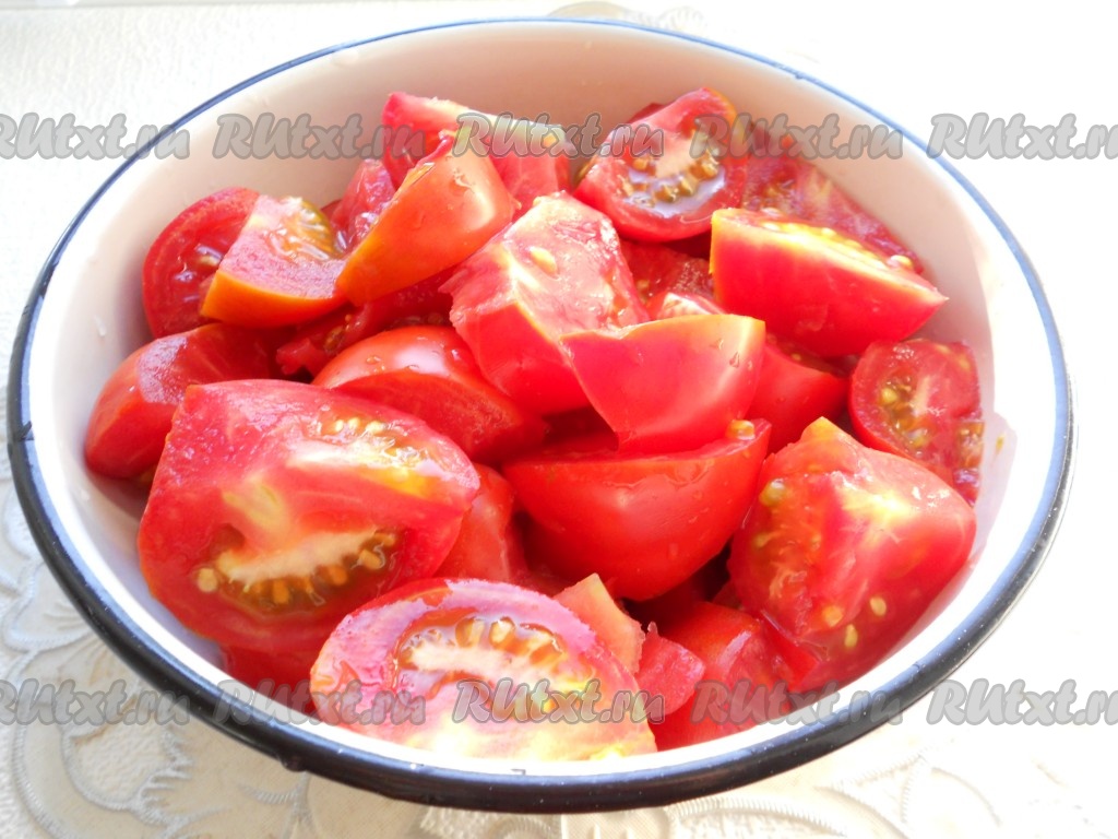 Помидоры помыть, удалить повреждения (если они имеются). Нарезать помидоры на 4-6 частей.