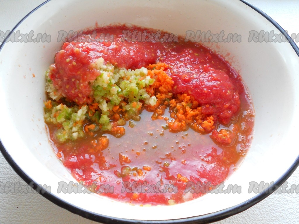 Далее все овощи перекрутить на мясорубке вместе с чесноком и горьким перцем.