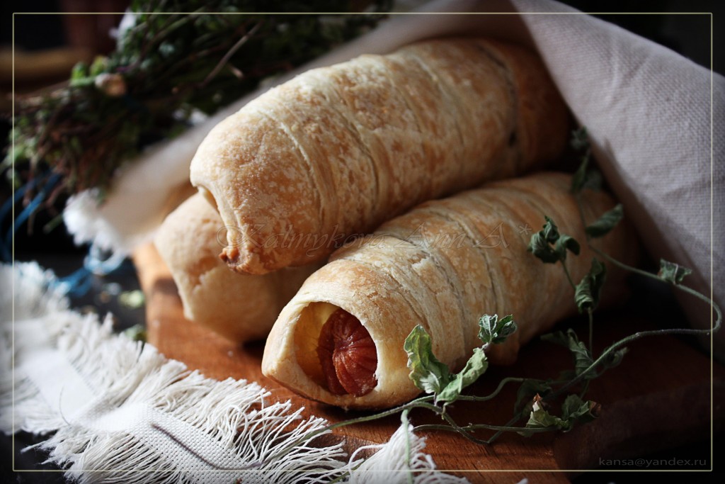 На противень, застеленный пекарской бумагой, выложить сосиски в слоеном тесте и выпекать в разогретой духовке при температуре 180 градусов 30-40 минут.