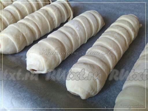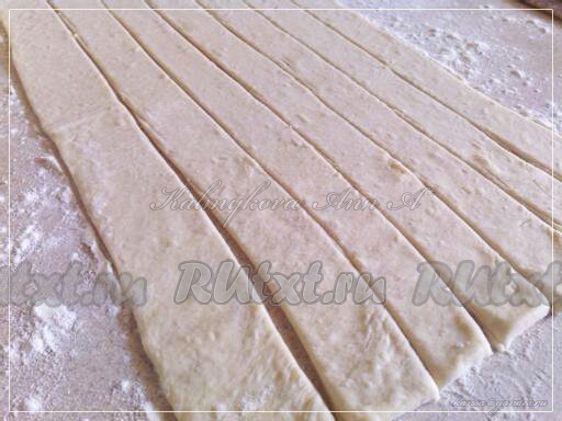 Разморозить слоеное дрожжевое тесто. Присыпать рабочую поверхность мукой, слегка раскатать пласт теста и нарезать полоски шириной около 2 см.