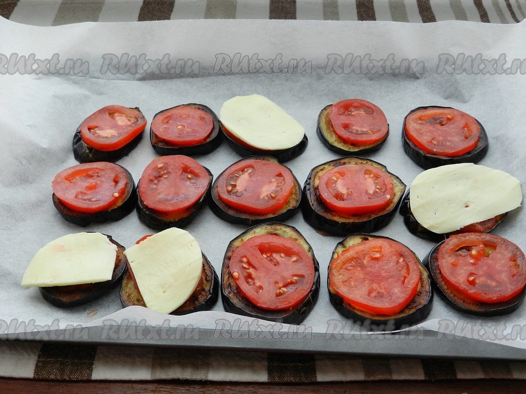 Небольшой противень застелить бумагой для выпечки. Выложить обжаренные баклажаны. На каждый кружочек баклажана положить кружочек помидора.