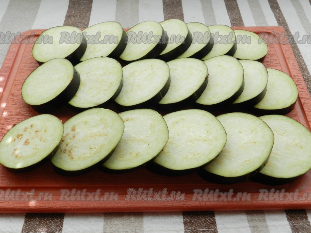 Баклажан нарезать кусочками толщиной около 1 см. Посолить и оставить на 20 минут. Затем соль смыть, баклажаны промокнуть салфеткой.