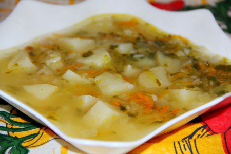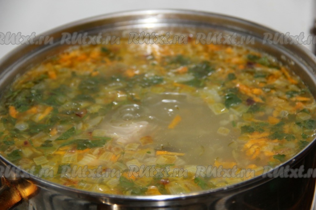 В самом конце отправляем в суп обжаренные морковь и лук, нарезанную зелень, доводим наш суп до кипения и выключаем.