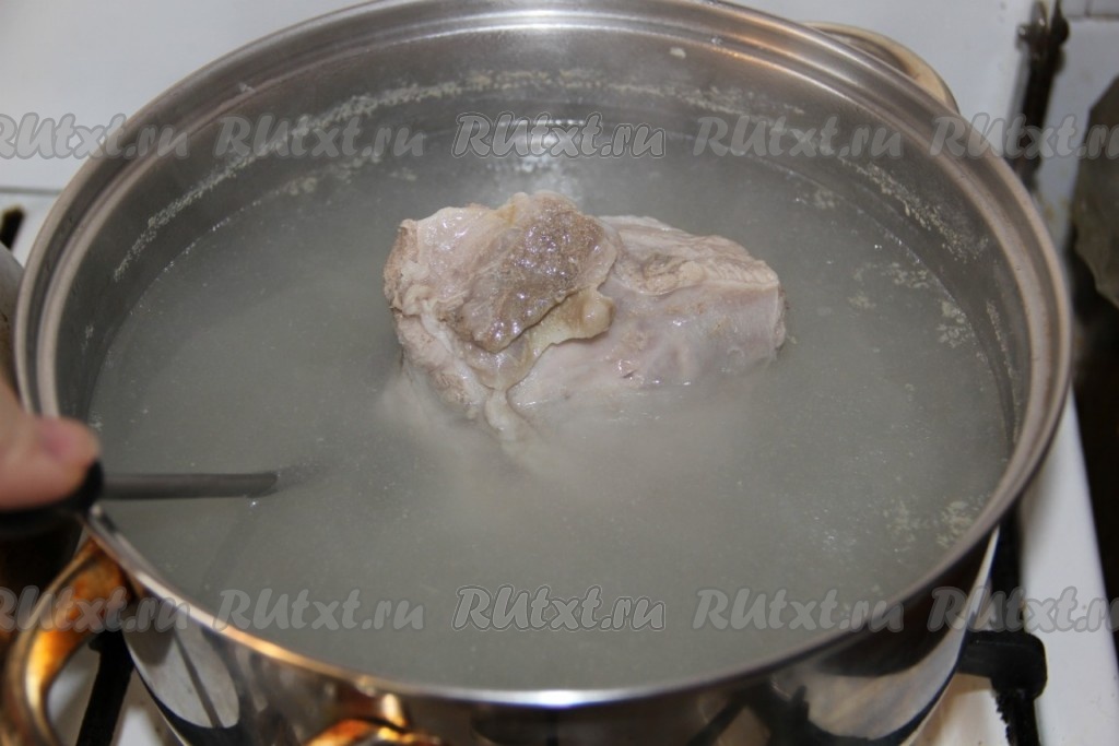 Мясо заливаем холодной водой, доводим до кипения, снимаем пену, огонь уменьшаем и варим до готовности мяса (примерно 1,5 часа).